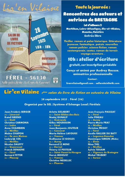 Cette année le SEL Férelais organise le 4ème Salon du Livre « Lir’En Vilaine » qui se tiendra ce dimanche 28 septembre de 10h à 18h à la salle polyvalente de Férel.